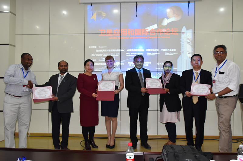 Ravan,国家航天局国际合作处处长江辉,区域中心执行主任、北航国际学院院长翁敬农为“空间与全球健康”国际培训班的学员颁发了结业证书。
