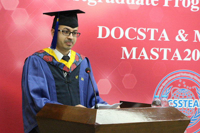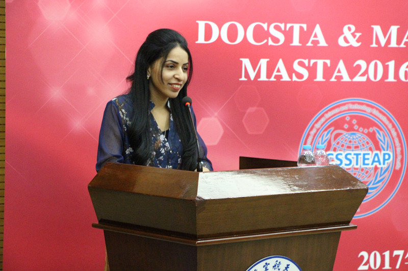 2016级硕士研究生、巴基斯坦学员阿以莎代表在校生发言,她回顾了与学长学姐共同经历的成长,并祝福他们前程似锦,同时感谢亚太空间合作组织、北航和区域中心在过去一年里所给予的帮助指导,让他们在学业上竿头日上,也表示将再接再厉,力争做一名德才兼备的北航人。