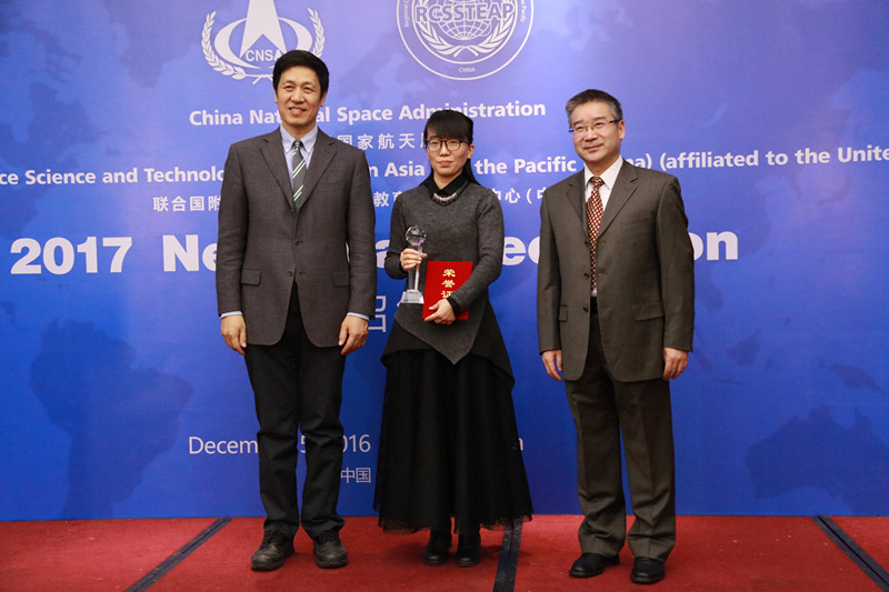 招待会上,还举行了“中心年度杰出贡献奖”和“中心年度优秀志愿者”的颁奖仪式,以对为中心发展作出突出贡献的老师和学员志愿者进行表彰。田玉龙秘书和徐惠彬校长为中心品牌设计师王鑫女士颁发了“年度杰出贡献奖”的荣誉证书和奖杯。成员国代表、巴西航天局局长黑蒙多先生和孟加拉国空间研究与遥感中心阿拉姆先生为中心学员蒙达尔颁发了“年度优秀志愿者”的荣誉证书和奖杯。