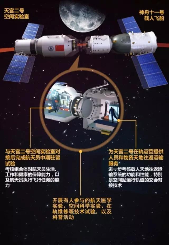 ②与天宫二号空间实验室对接形成组合体,进行航天员中期驻留,考核组合体对航天员生活、工作和健康的保障能力,以及航天员执行飞行任务的能力;
