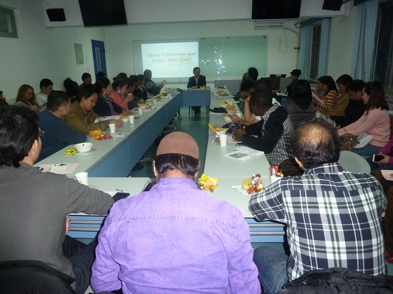2014年12月29日,在校的空间技术应用项目研究生在国际学院五层505教室欢聚一堂,互相祝贺新年,并进行了座谈、交流一年来的北航学习和生活感受,气氛轻松热闹。会上,联合国附属空间科技教育亚太区域中心(中国)副主任翁敬农简要回顾本学期的主要工作。项目主管郭媛媛介绍了期末的课程和实践活动,并给出了各年级、不同专业下学期初的专业实践详细安排。会后,大家一起合影留念,庆贺新年。