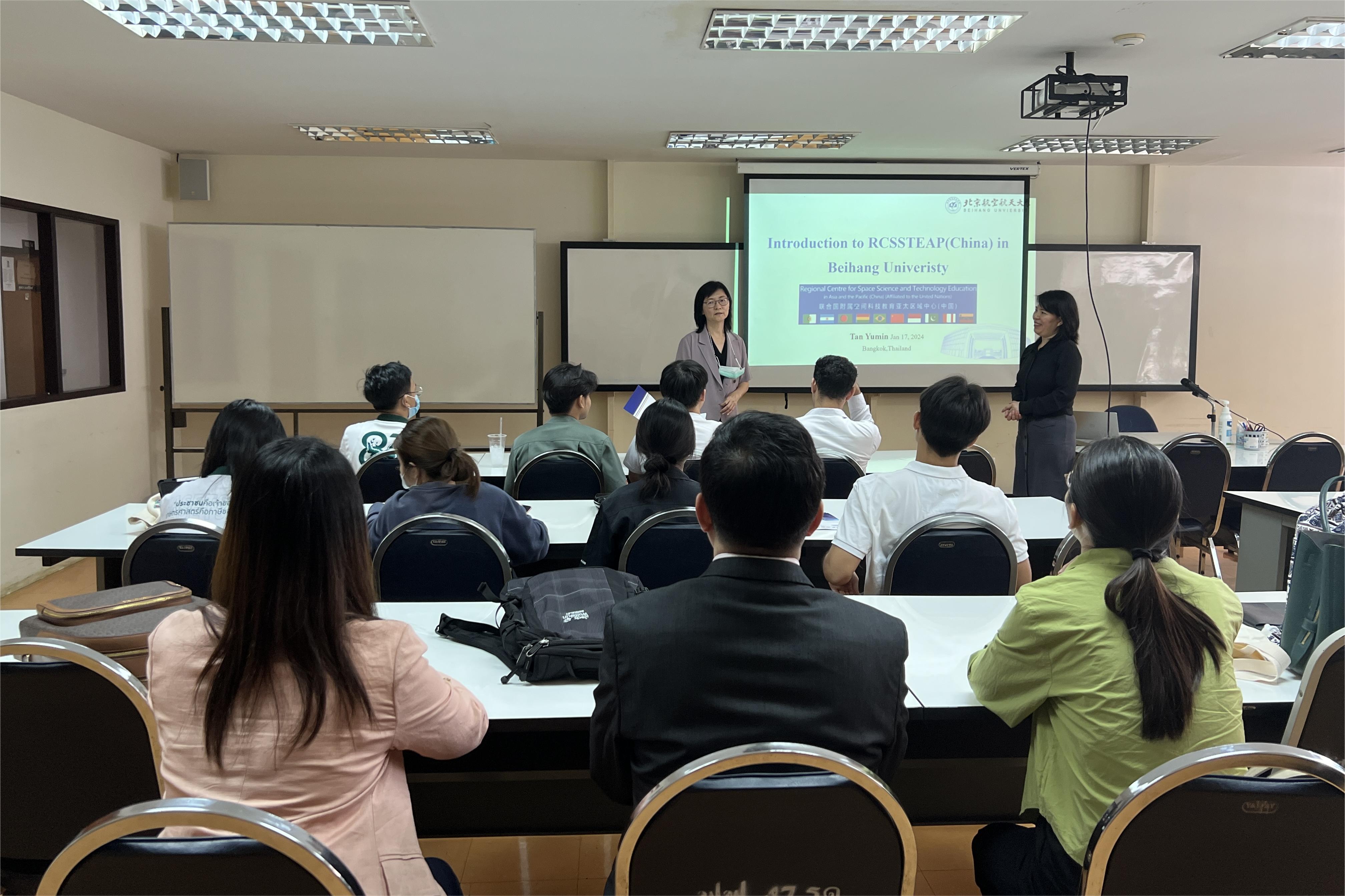 2024年1月15日至1月17日,联合国附属空间科技教育亚太区域中心(中国)(以下简称中心)遥感与地理信息系统方向责任教授谭玉敏、全球卫星导航方向教授杨东凯、微小卫星技术方向副教授陈珅艳、中心办公室唐倩等一行赴泰国访问交流。代表团先后访问了马汉科理工大学、诗纳卡宁威洛大学、泰国农业大学等高校,就空间技术应用领域学生培养、师生交流、科研合作等议题进行了深入交流。